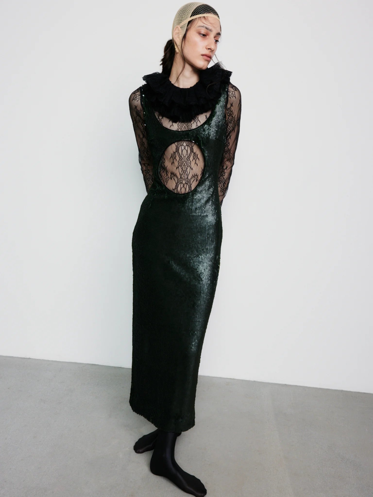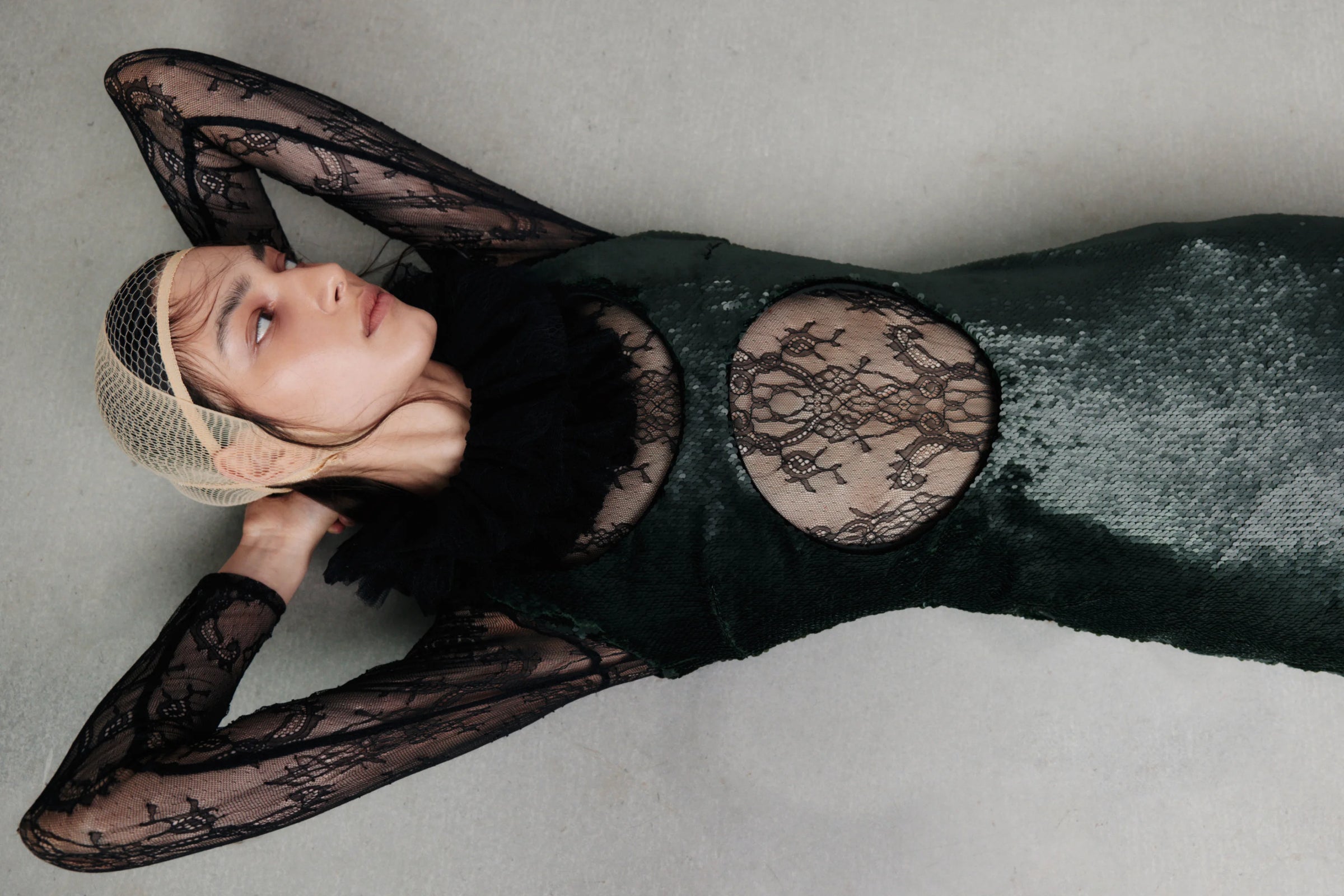 Платье-бюстье из пайеток и бархата с декоративным бантом