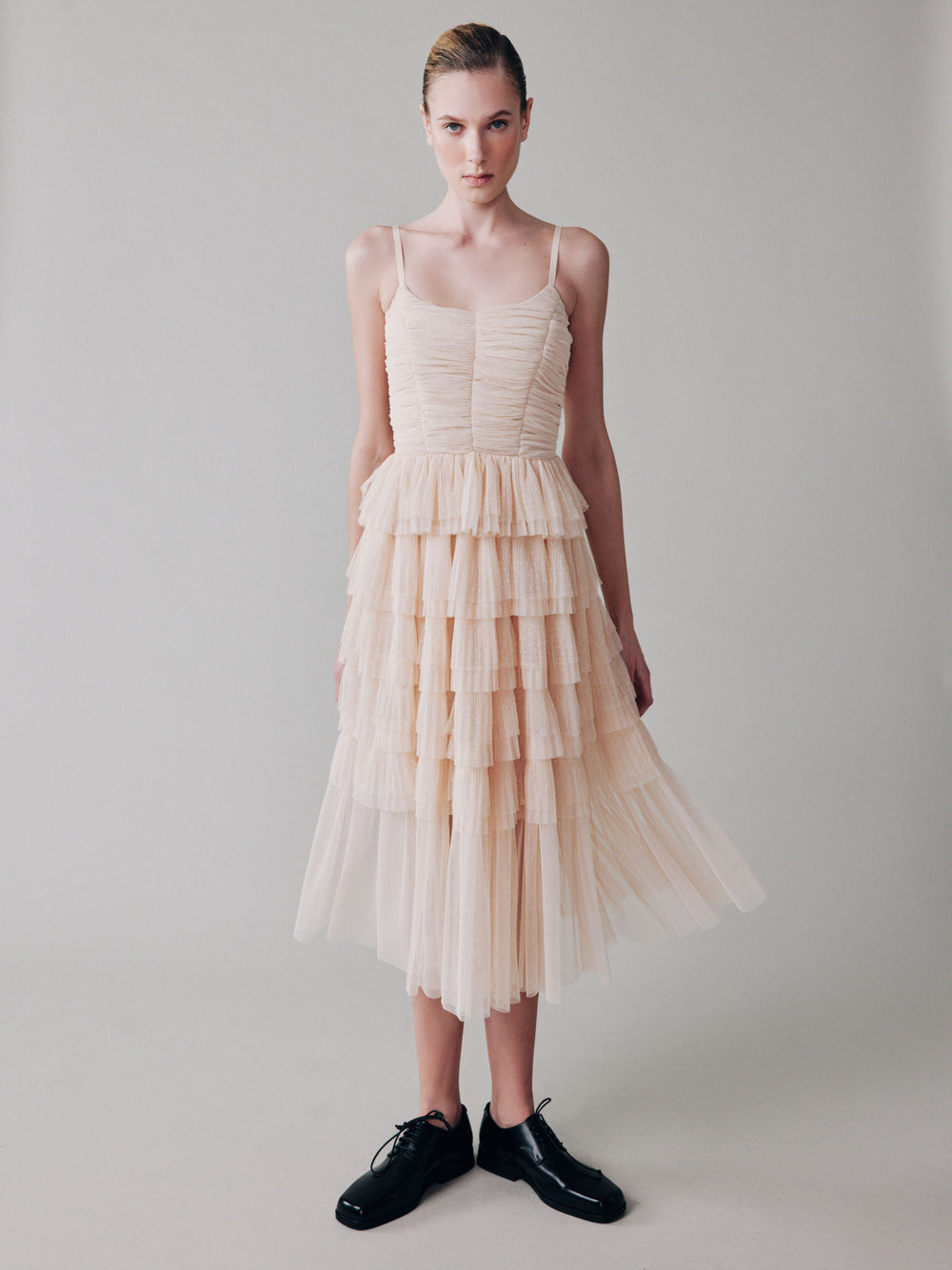 Платье с воланами из мягкой сетки гофре в горошек