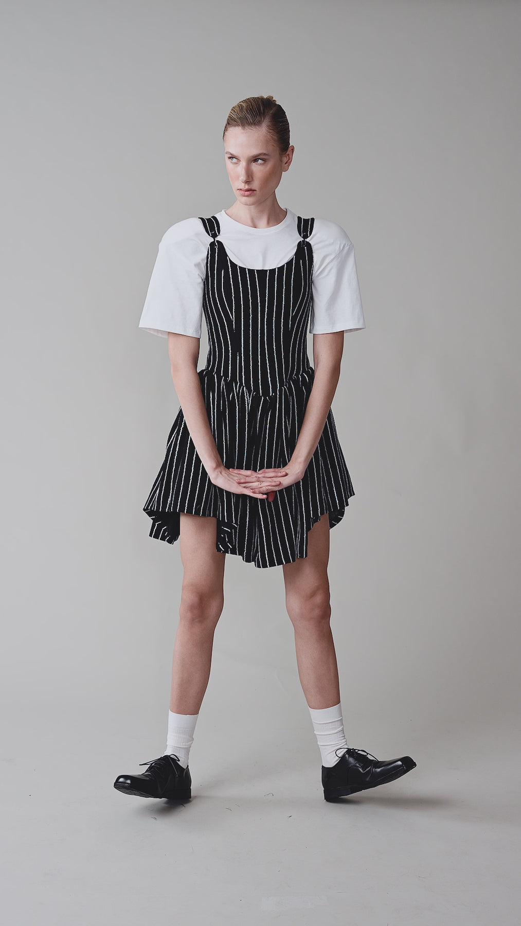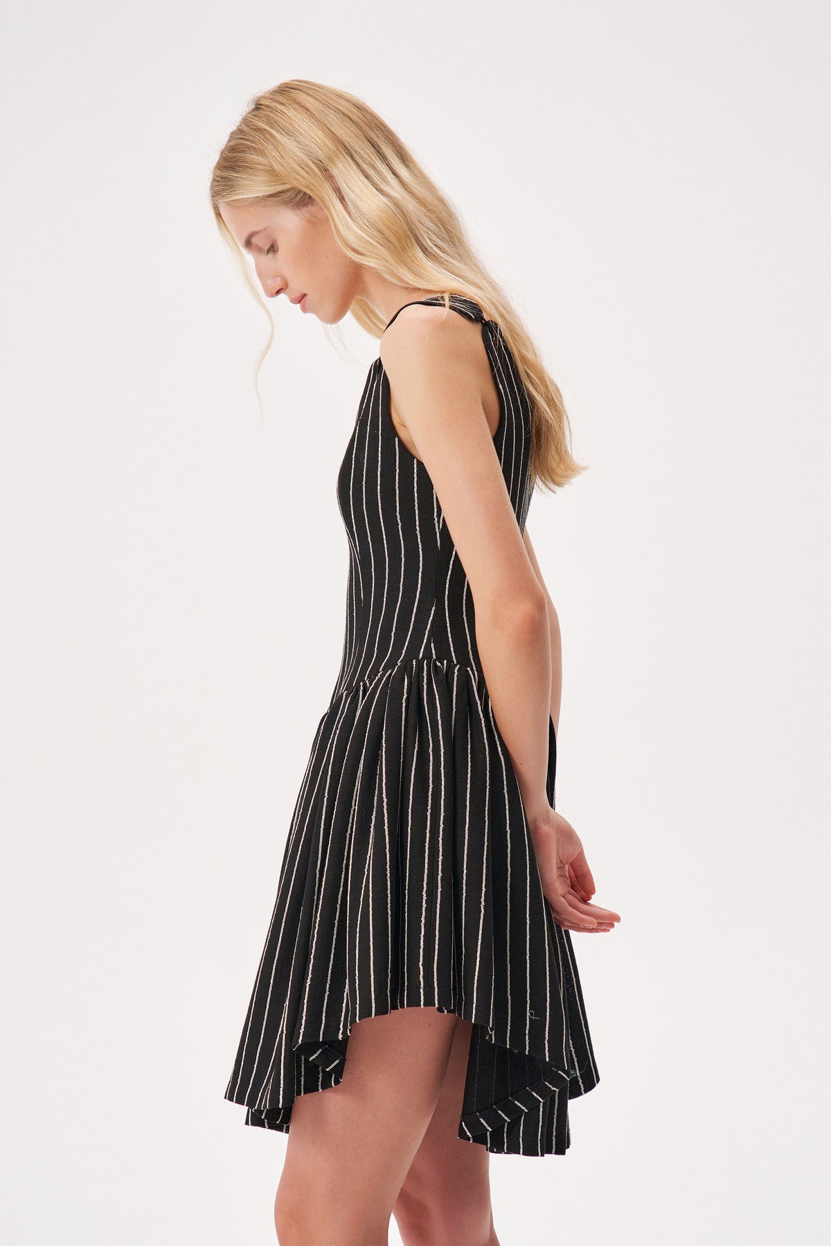 Платье, выполненное из льняной ткани в полоску, декорированной мелкими пайетками белого цвета. Лиф корсетного типа. Объёмная юбка со сборкой на талии и укороченная по бокам.