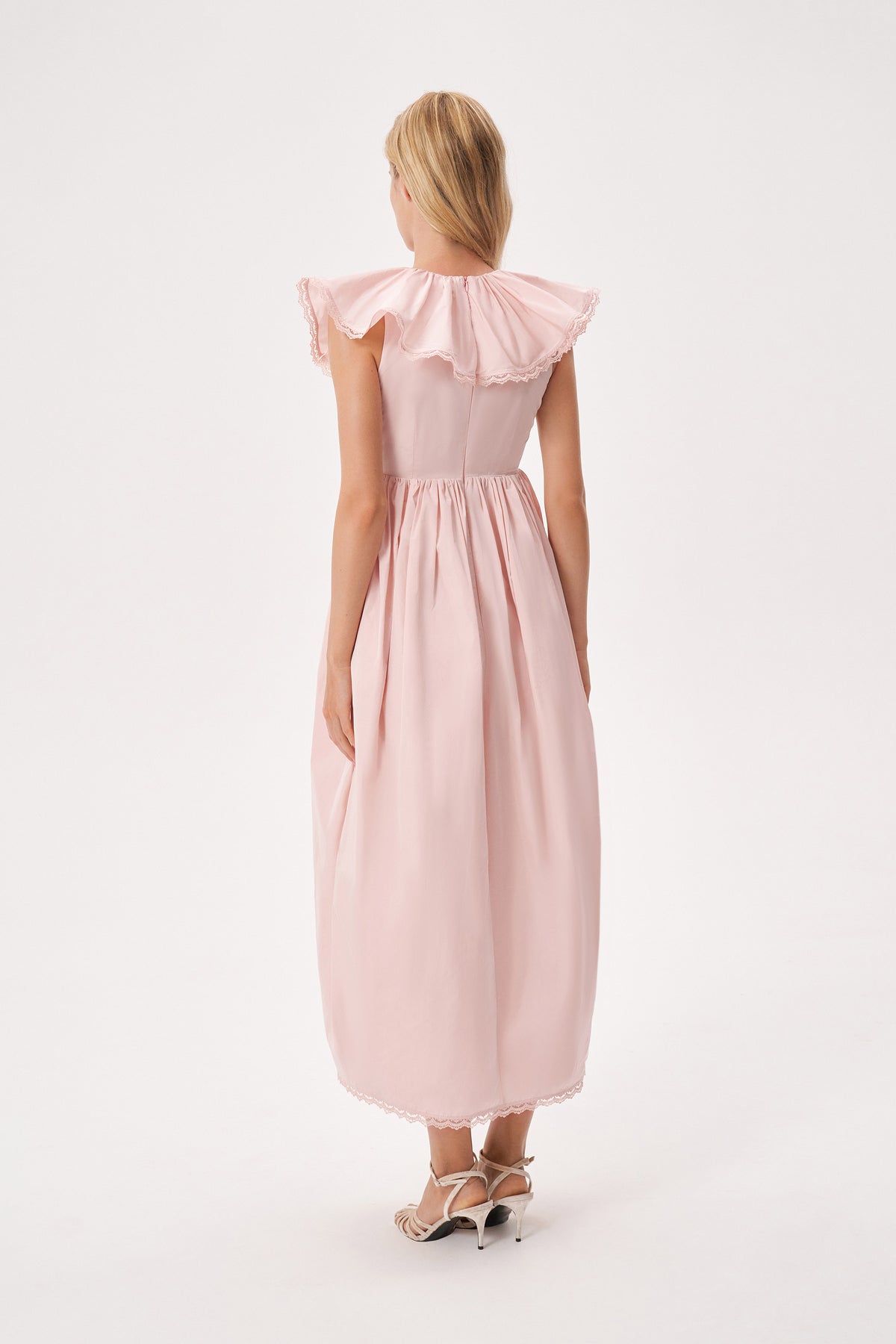 Платье, выполненное из тафты. Лиф с V-образным вырезом и оборкой с кружевной тесьмой. На лифе декоративный бант из кружева. Юбка силуэта «тюльпан», сборка по линии талии. По низу платья – кружевная тесьма.