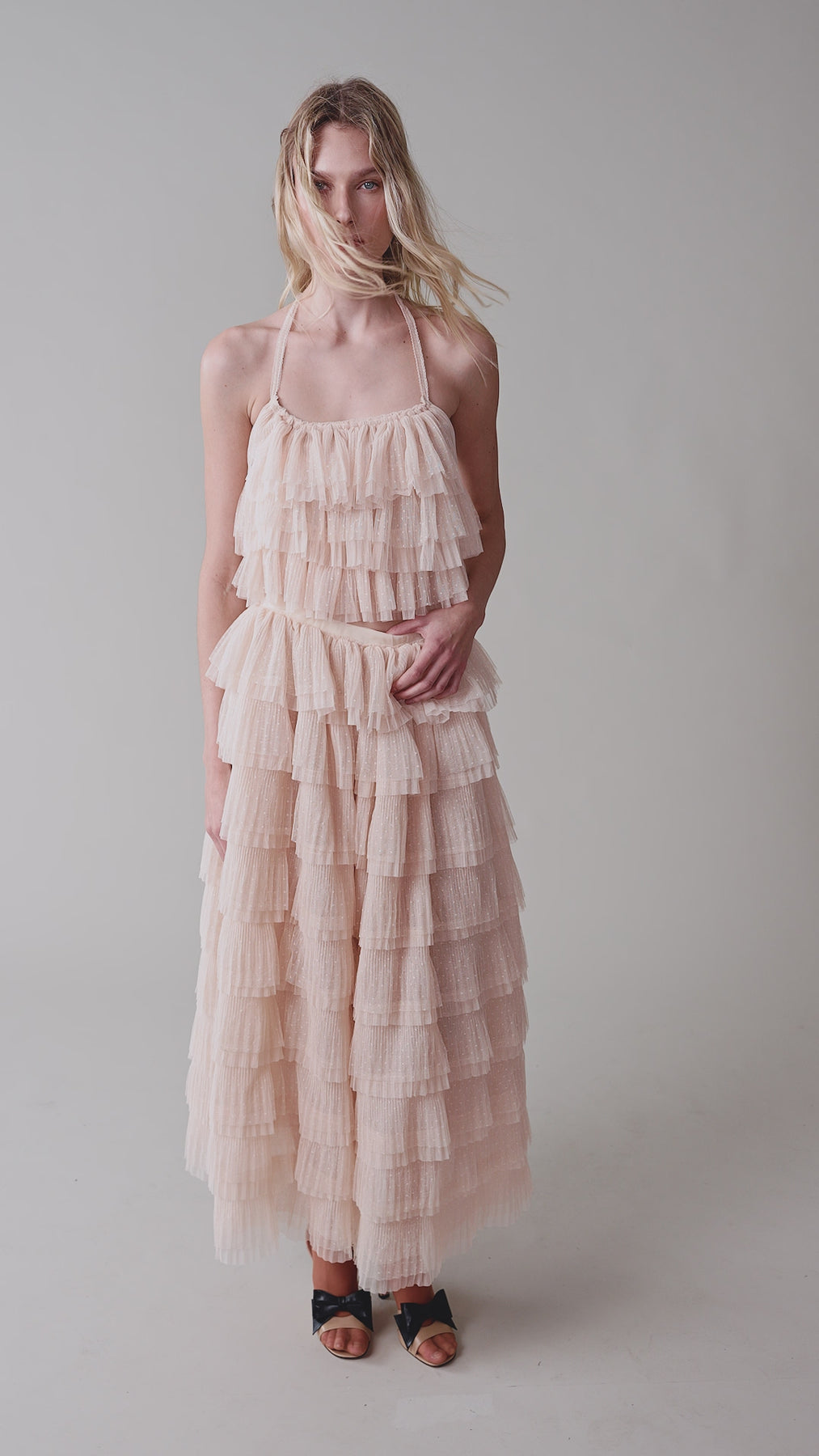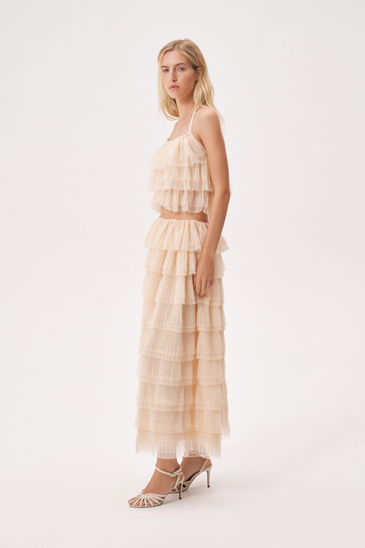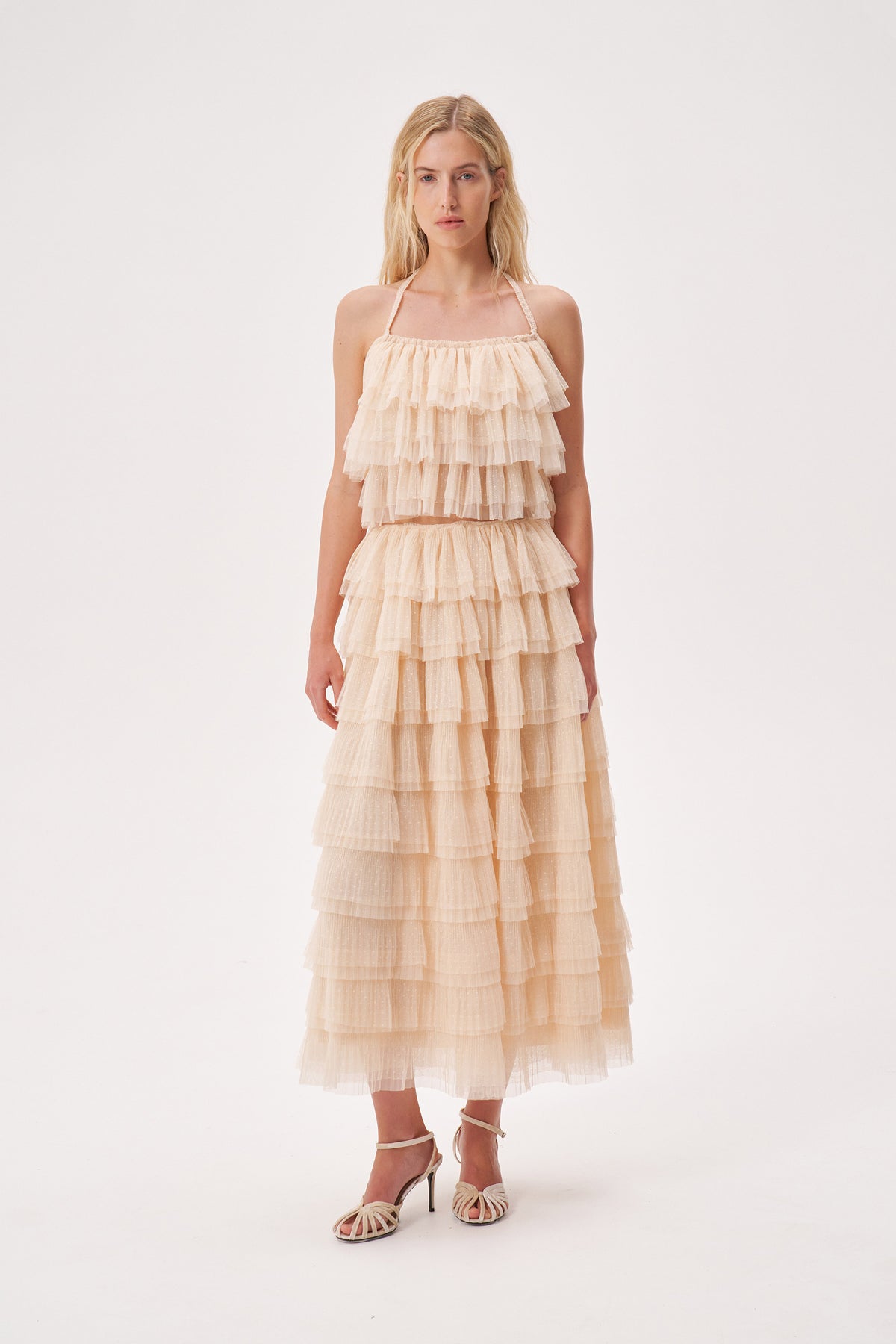 Юбка свободного силуэта, выполненная из мягкой сетки гофре с узором «в горошек».
