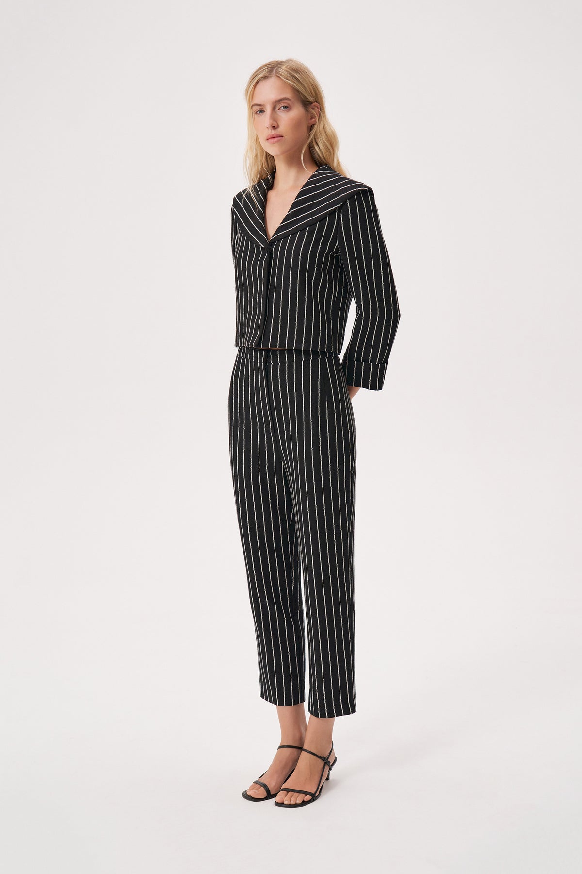 Укороченные брюки на талии, выполненные из льняной ткани в полоску, декорированной пайетками белого цвета.