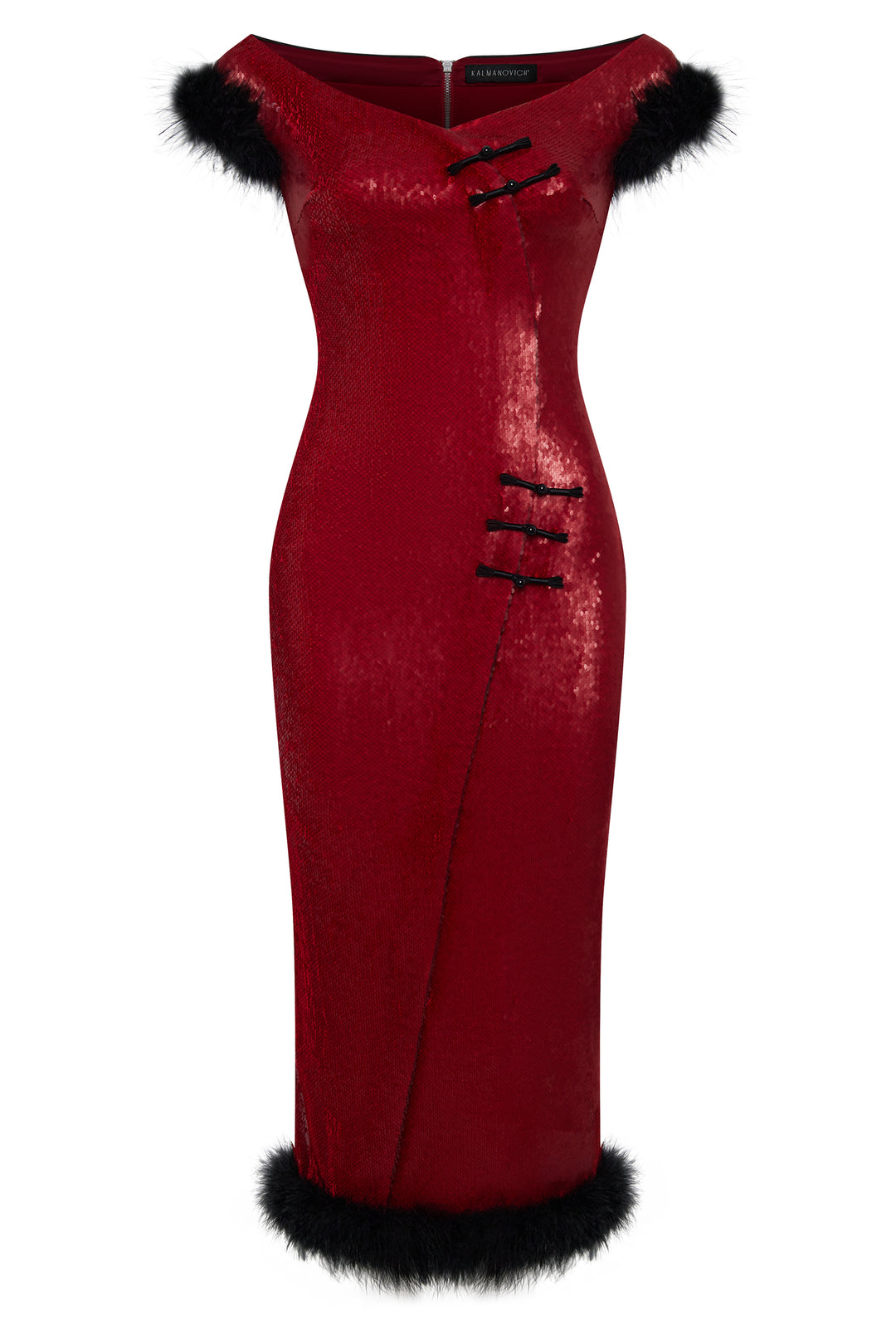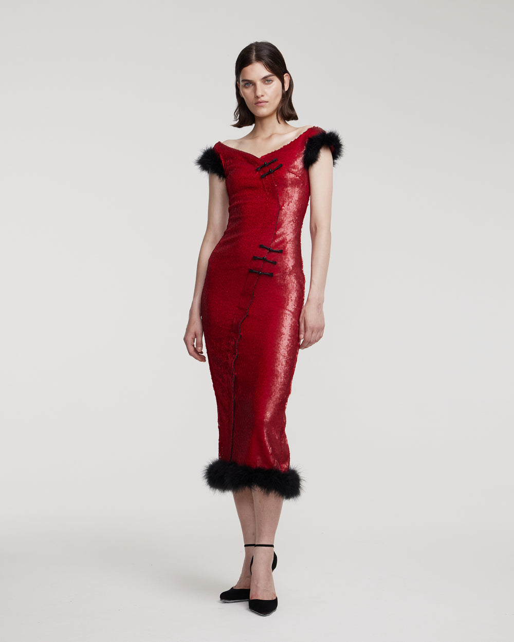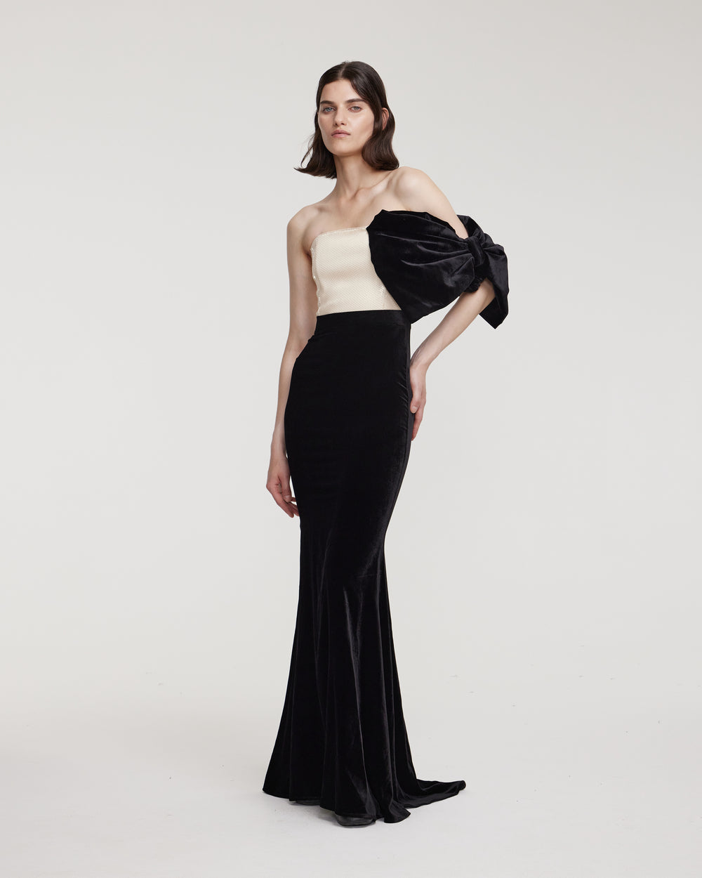 Платье-бюстье из пайеток и бархата с декоративным бантом