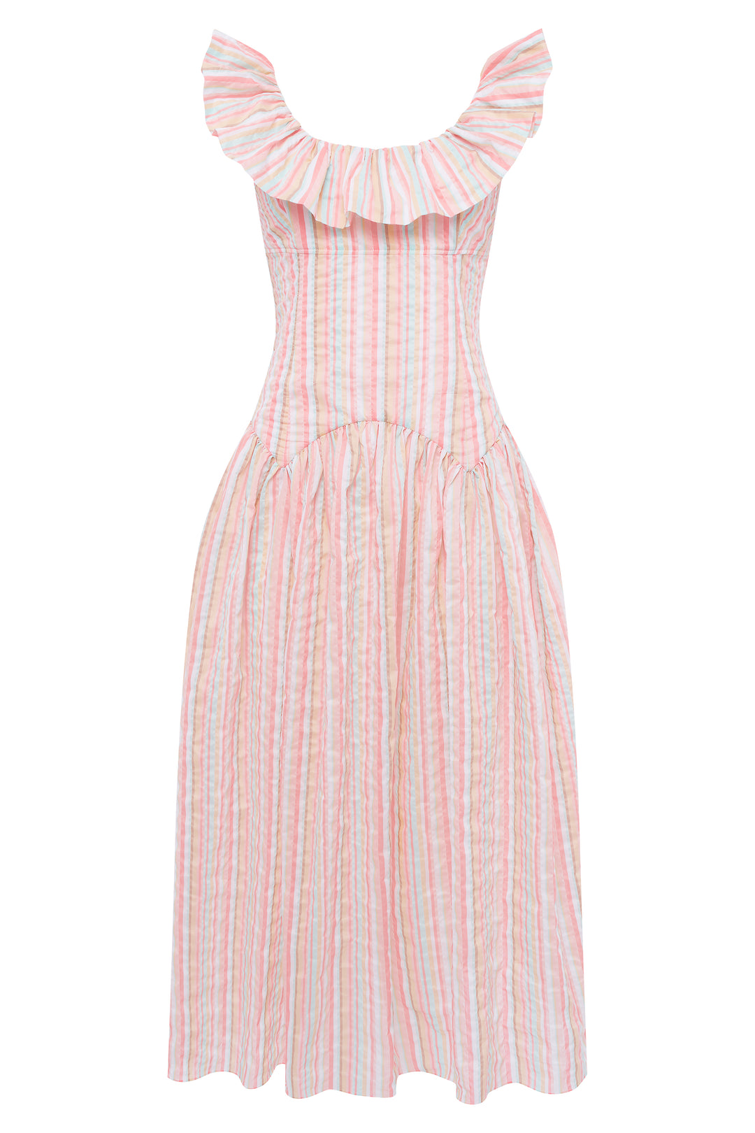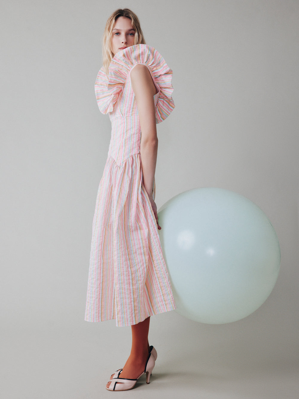 Платье из тафты на тонких бретелях с разрезом и оборками