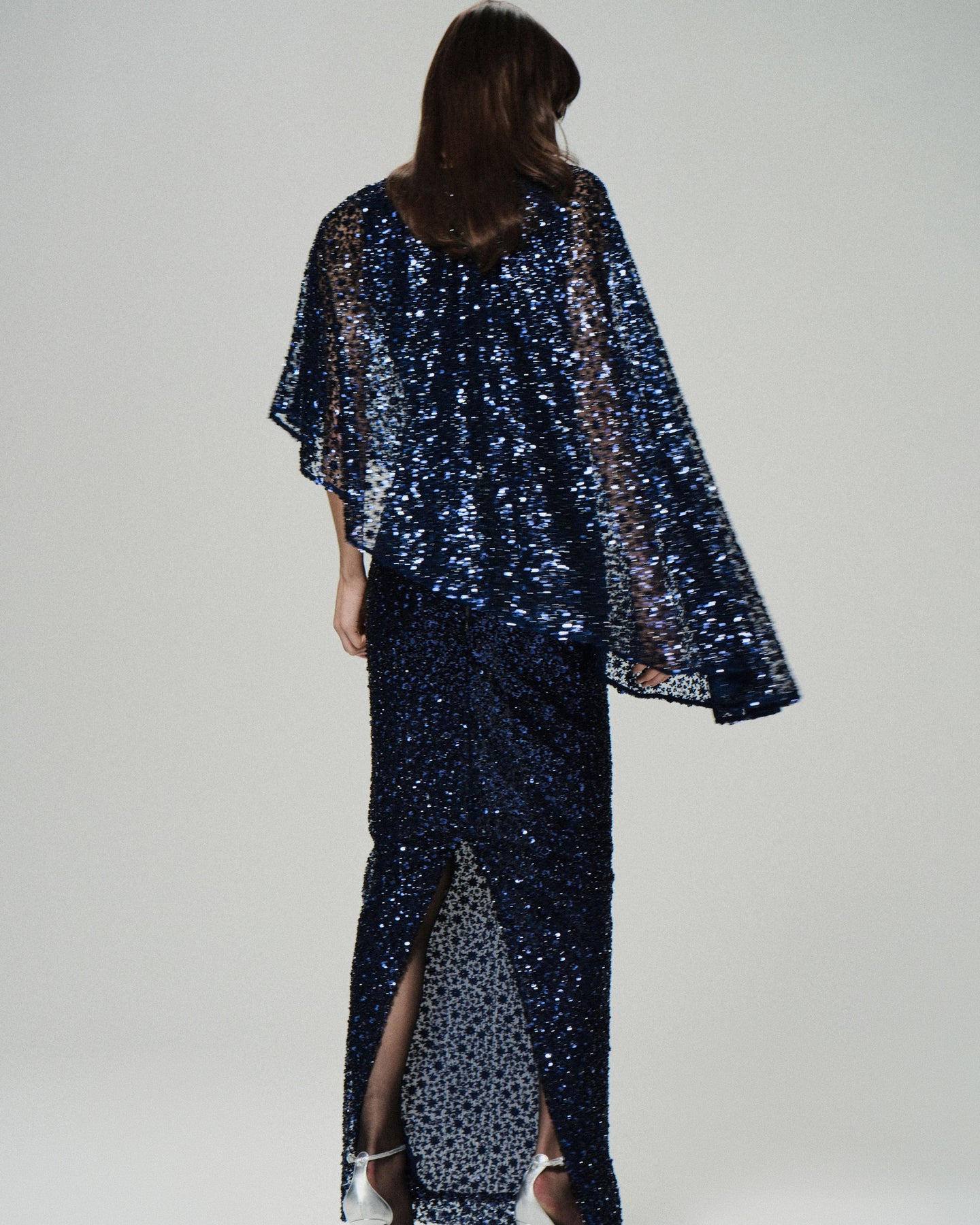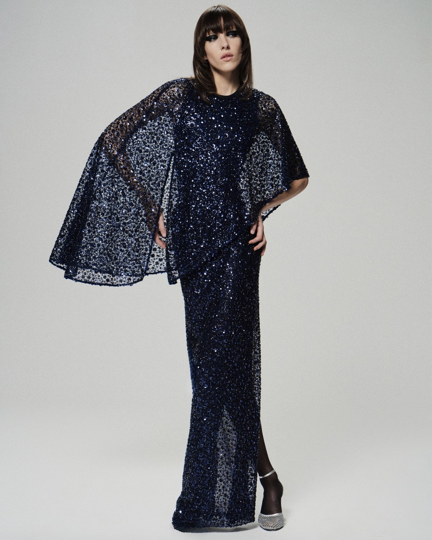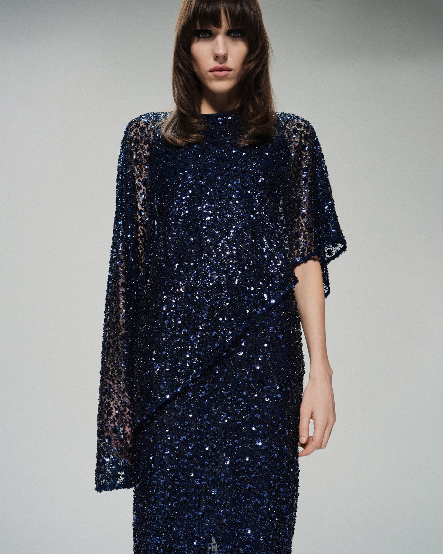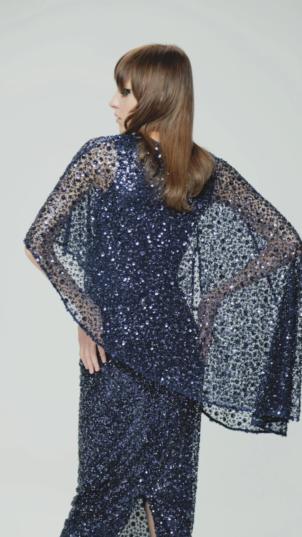 Кейп «летящего» силуэта, выполненный из ткани, декорированной бисером и пайетками. Кейп имеет встроенное боди без рукавов.