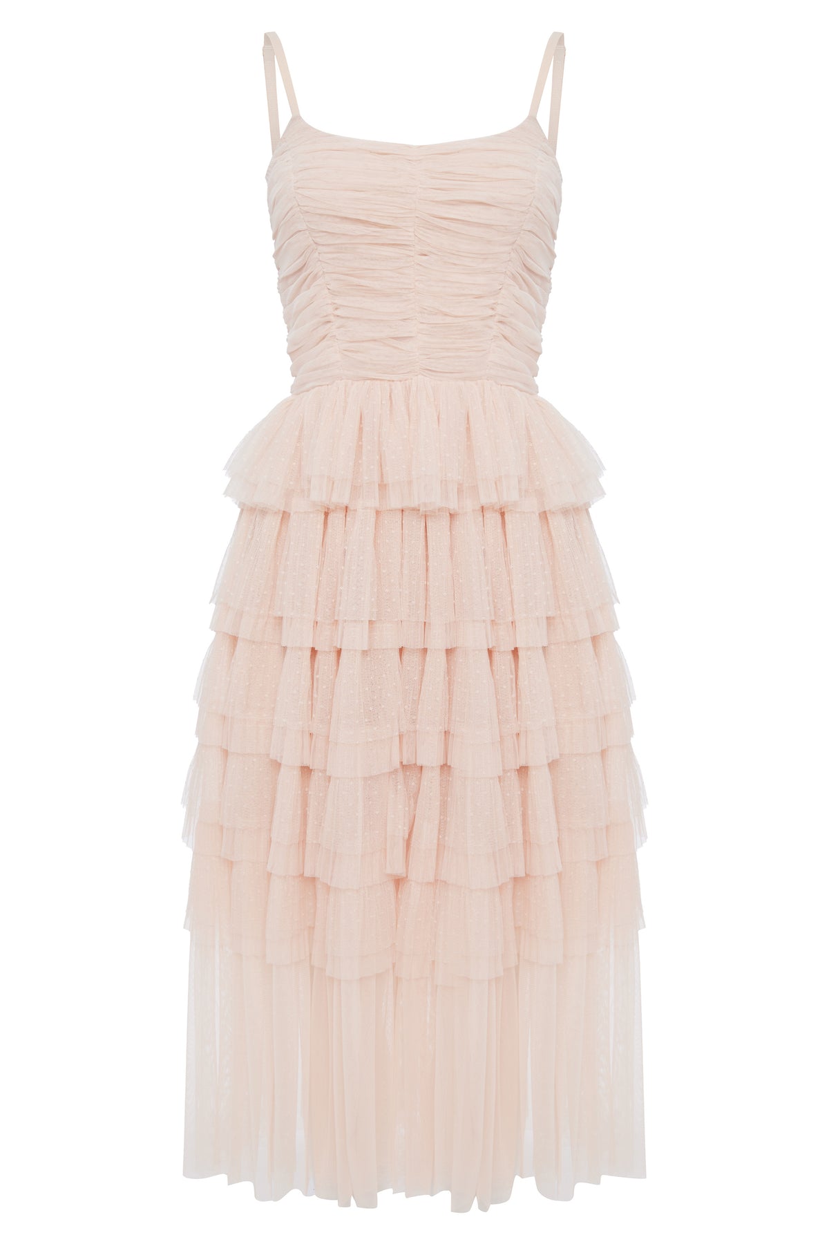 Платье с воланами, выполненное из мягкой сетки гофре с узором «в горошек». Приталенный силуэт лифа c фактурной драпировкой. Тонкие регулируемые бретели.