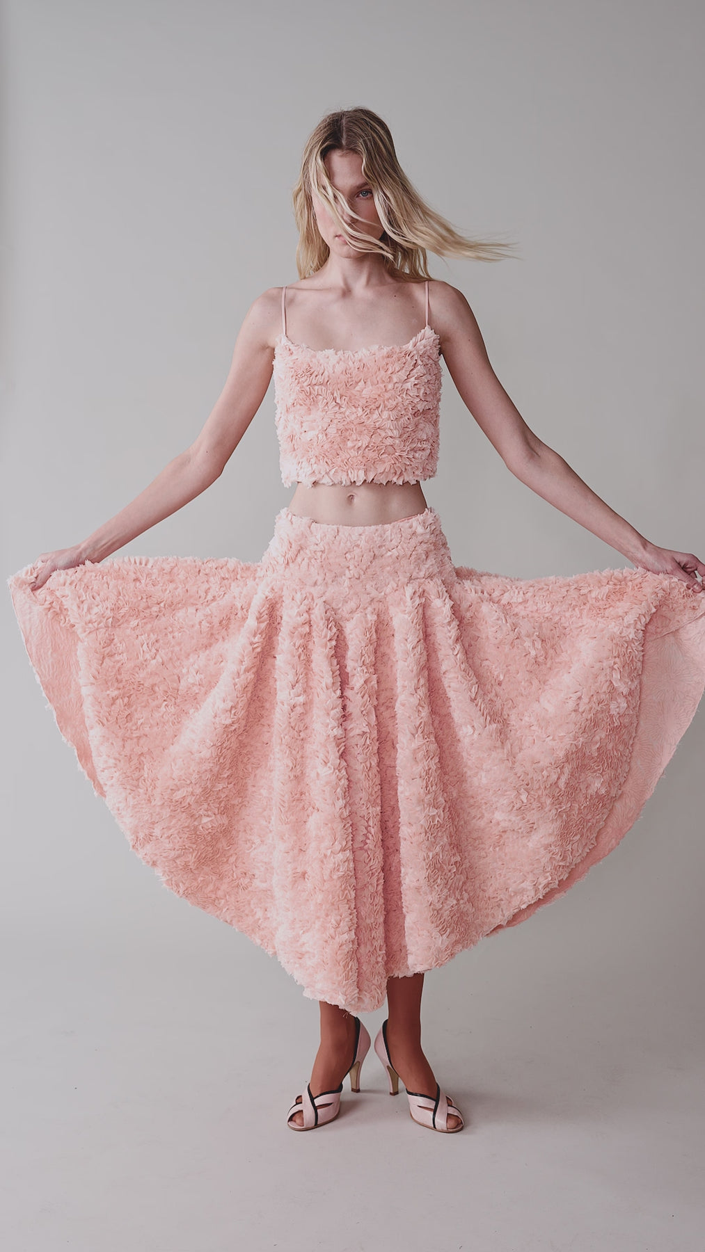 Укороченный топ на тонких лямках, выполненный из фактурной ткани, декорированной объемными лепестками.